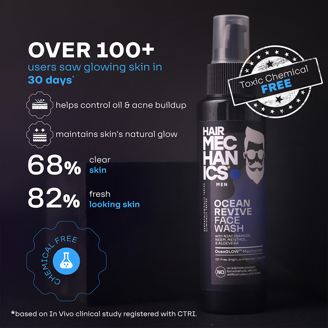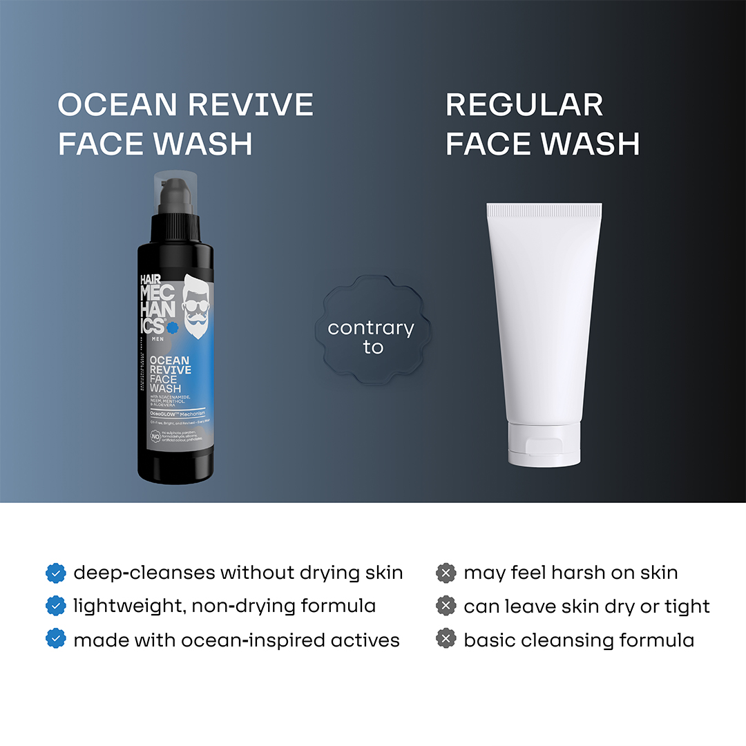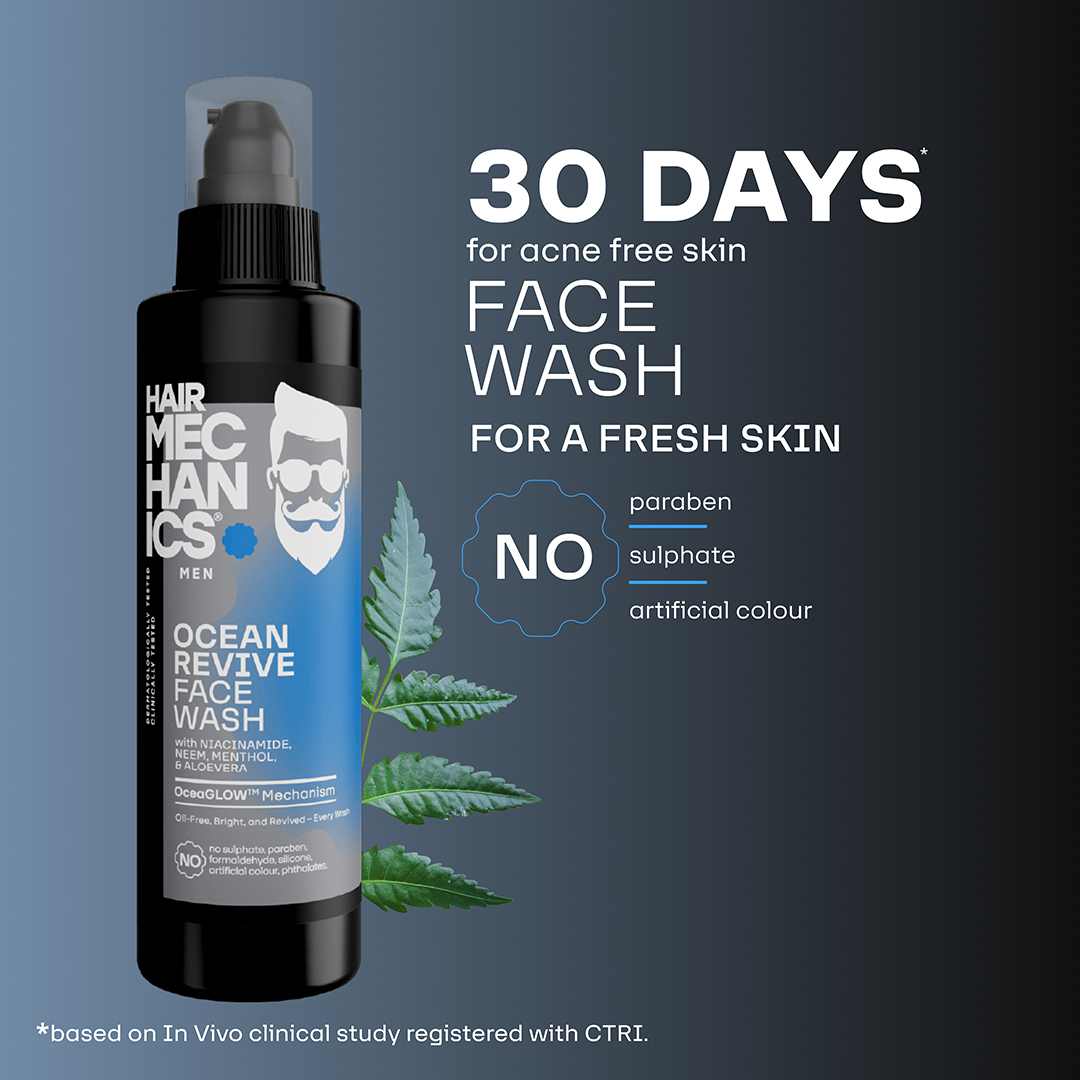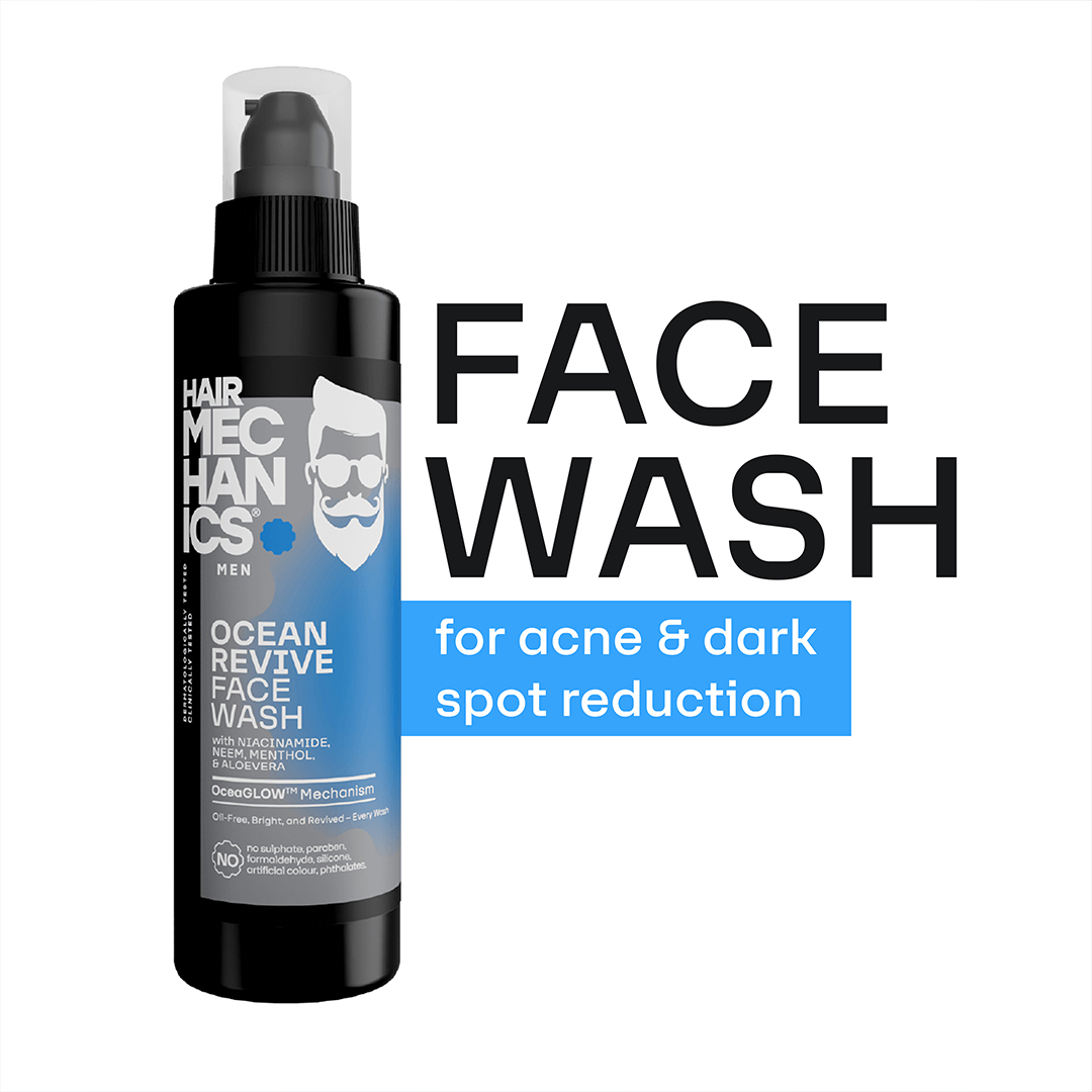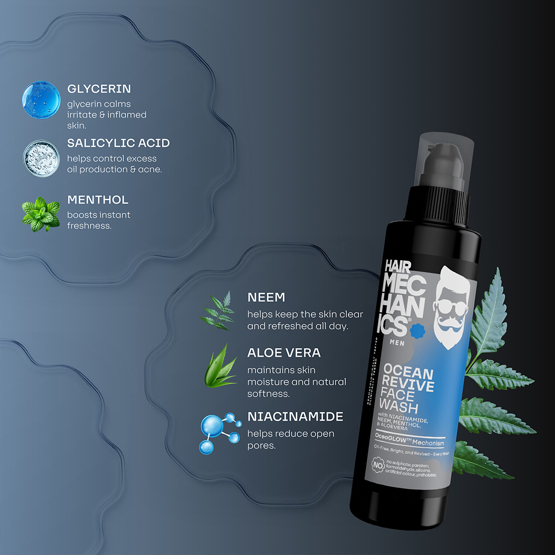 Ocean Revive Face Wash by Hair Mechanics is a refreshing, ocean-inspired facial cleanser designed specifically for men. Enriched with Niacinamide, Neem, Menthol, and Aloe Vera, this face wash deeply cleanses the skin, removes impurities, and helps control oiliness, leaving your skin feeling fresh and revitalized. Its cooling formula invigorates tired skin, soothes irritation, and provides a smooth, energized feel. Free from sulPHAtes, parabens, silicones, artificial colors, and phthalates, Ocean Revive Face Wash is a safe and effective choice for men who want clear, healthy-looking skin.