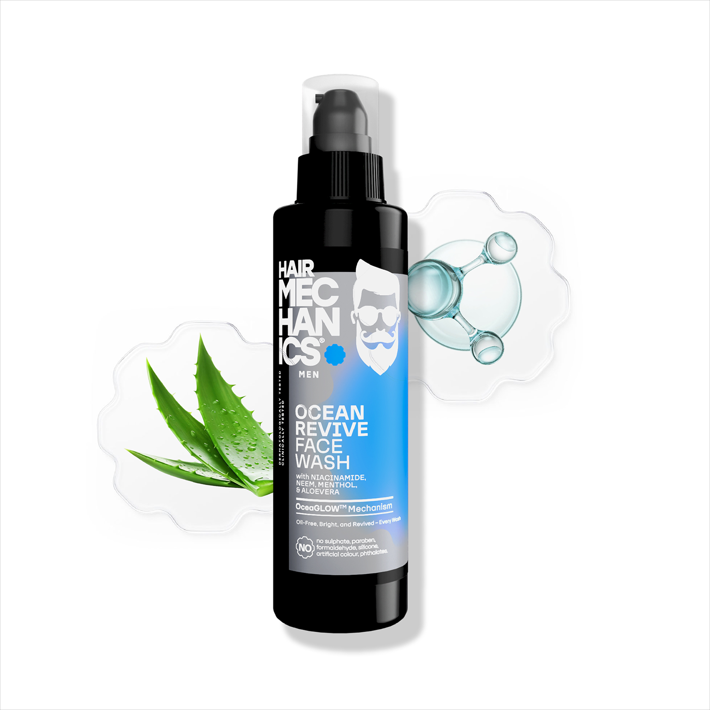 Ocean Revive Face Wash by Hair Mechanics is a refreshing, ocean-inspired facial cleanser designed specifically for men. Enriched with Niacinamide, Neem, Menthol, and Aloe Vera, this face wash deeply cleanses the skin, removes impurities, and helps control oiliness, leaving your skin feeling fresh and revitalized. Its cooling formula invigorates tired skin, soothes irritation, and provides a smooth, energized feel. Free from sulPHAtes, parabens, silicones, artificial colors, and phthalates, Ocean Revive Face Wash is a safe and effective choice for men who want clear, healthy-looking skin.